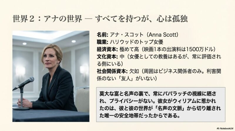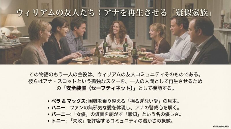 この質問に対して、アナが迷いなく答えたことで、彼女が「旅立つスター」としての生き方を手放し、ウィリアムと共にこの場所で生きていくことを選んだことが明確になります。ドミニクの質問は、最後の一言を引き出すための重要な役割を果たしていたと言えるでしょう。